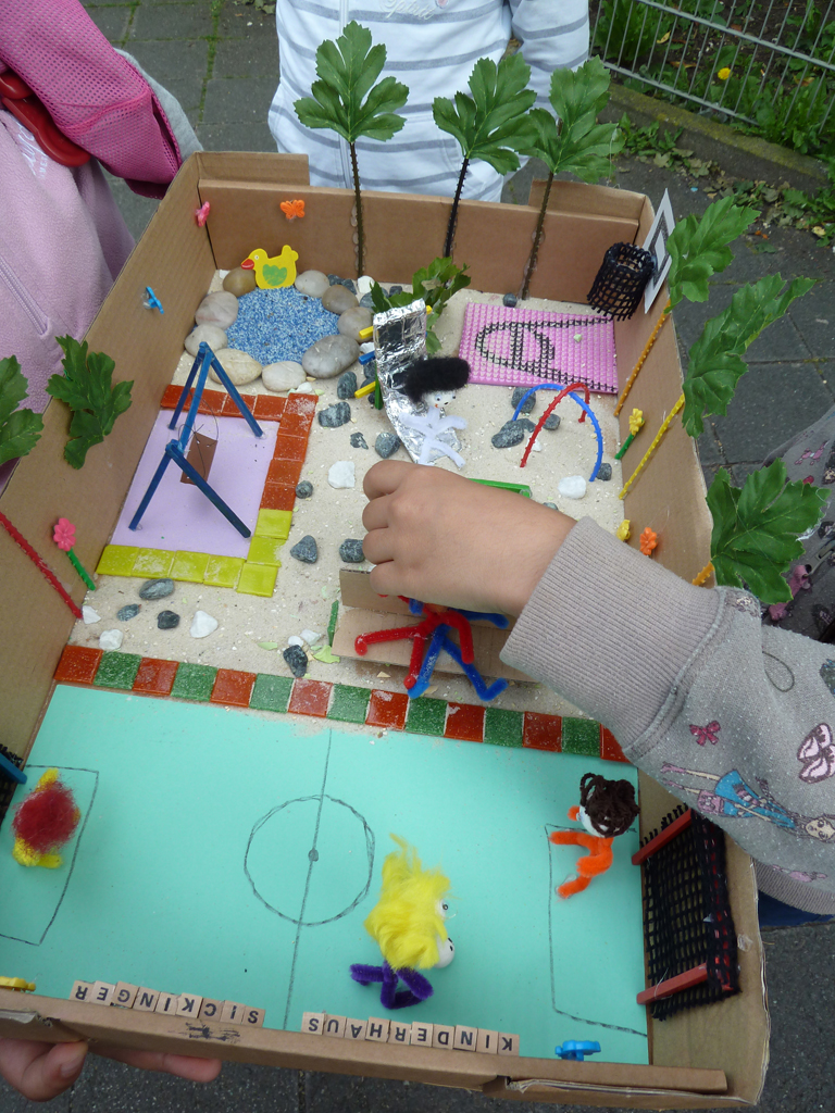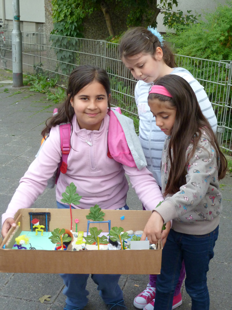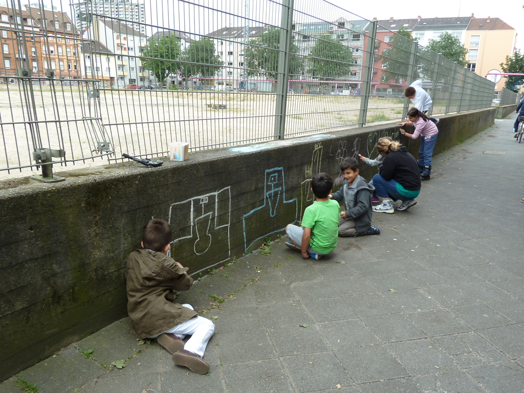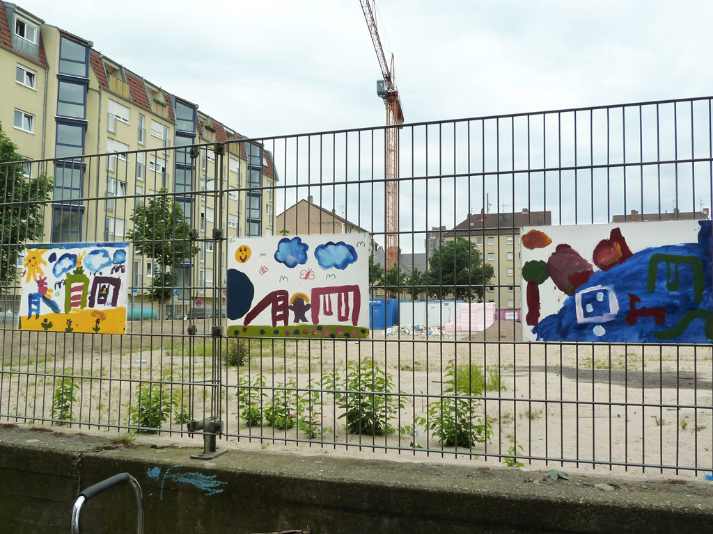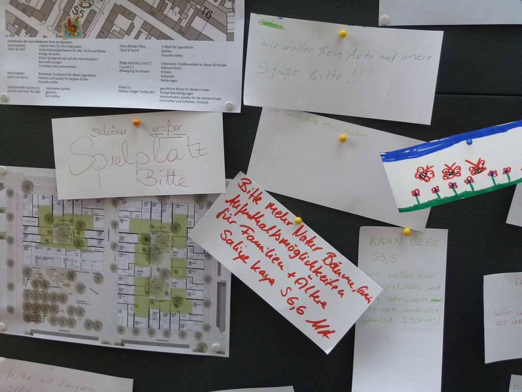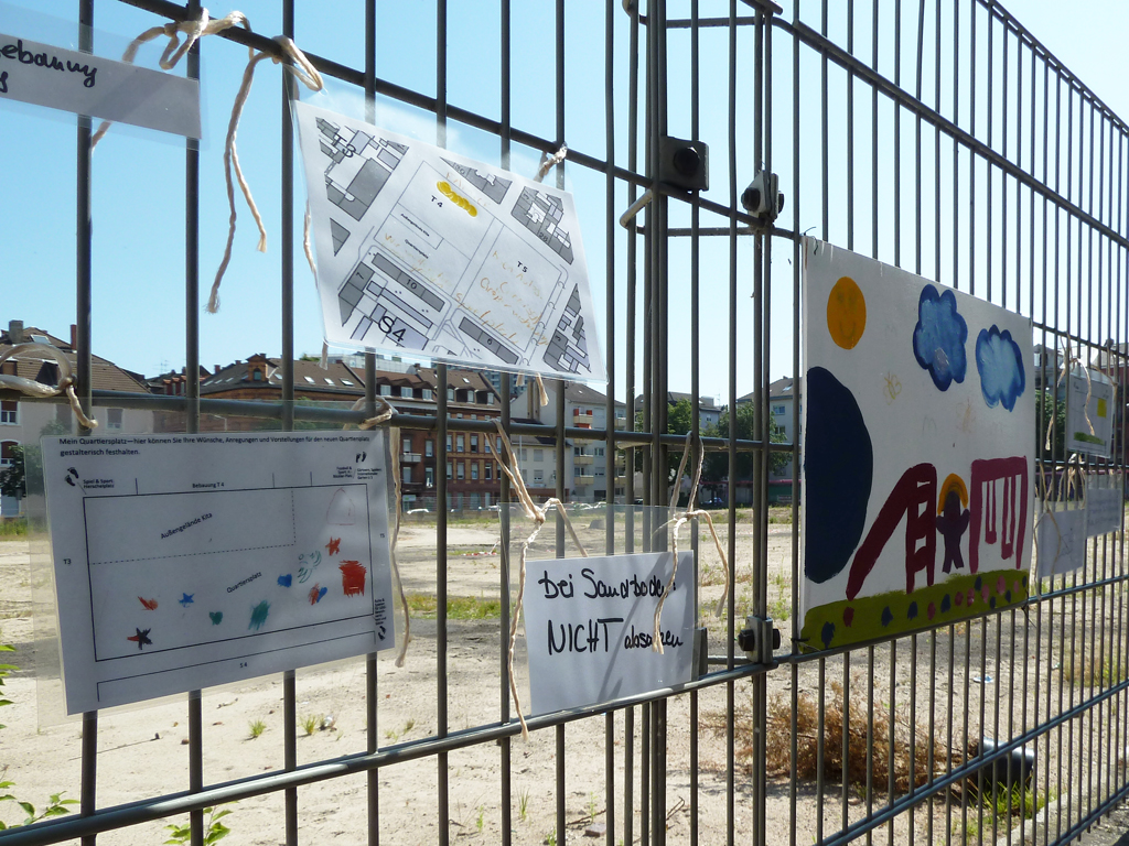 Im Zuge der Info- und Mitmachstände zur Gestaltung des zukünftigen Quartierplatzes auf T 4 konnten gemeinsam mit Engagierten aus dem Quartier zahlreiche Vorschläge für den neuen Quartiersplatz gesammelt werden. Kinder bastelten Blumen und malten ihre Vorstellungen des Quartiersplatzes auf wasserfeste Leinwände. Außerdem wurden Entwürfe für den neuen Platz auf vorgedruckte Pläne gemalt und Wünsche auf Kärtchen an eine Stellwand geschrieben werden. Die Ergebnisse waren über die Sommermonate am Zaun zu bewundern.