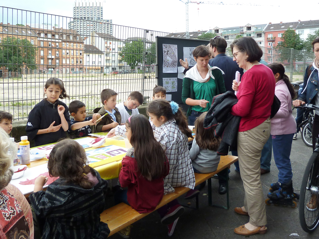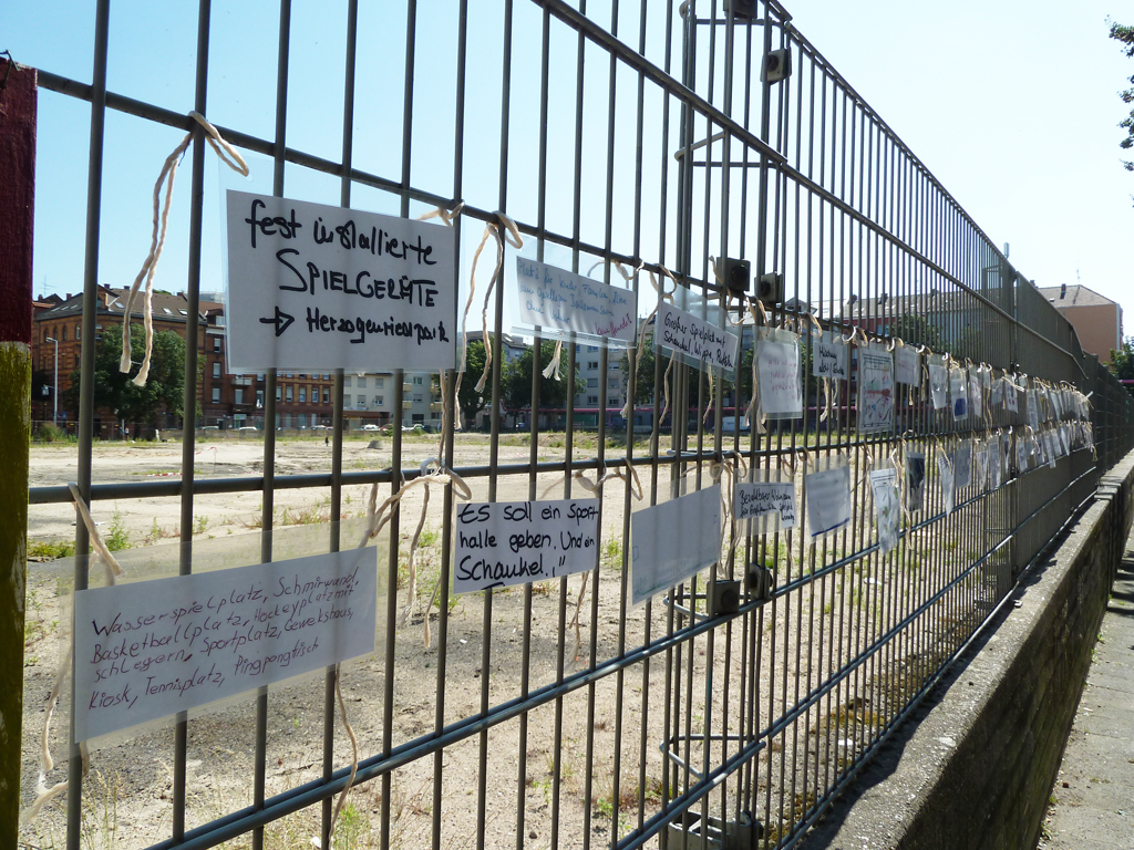 Im Zuge der Info- und Mitmachstände zur Gestaltung des zukünftigen Quartierplatzes auf T 4 konnten gemeinsam mit Engagierten aus dem Quartier zahlreiche Vorschläge für den neuen Quartiersplatz gesammelt werden. Kinder bastelten Blumen und malten ihre Vorstellungen des Quartiersplatzes auf wasserfeste Leinwände. Außerdem wurden Entwürfe für den neuen Platz auf vorgedruckte Pläne gemalt und Wünsche auf Kärtchen an eine Stellwand geschrieben werden. Die Ergebnisse waren über die Sommermonate am Zaun zu bewundern.